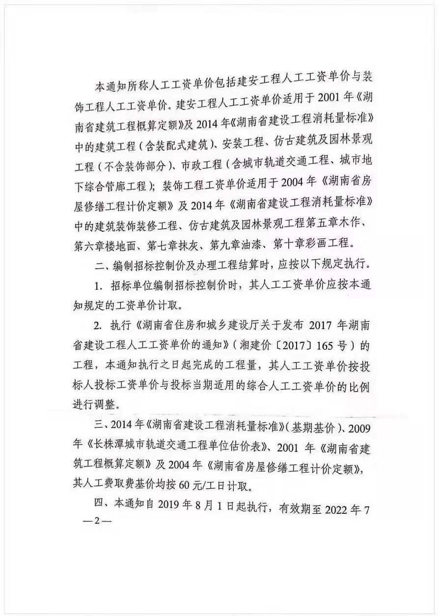 湘建价[2019] 130号 2019年湖南省建设工程人工工资单价的通知
